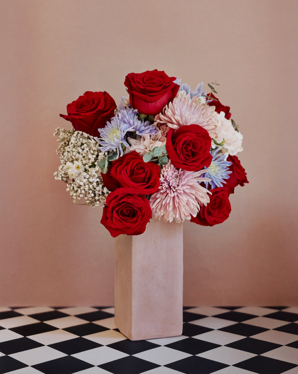 Captivate hearts with our "Queen of Hearts" bouquet – a regal blend of bold red roses, soft pink chrysanthemums, and striking Japanese blue pom poms, all delicately wrapped in ethereal baby's breath. This majestic arrangement commands attention while maintaining an air of effortless grace, making it perfect for those who appreciate classic beauty.