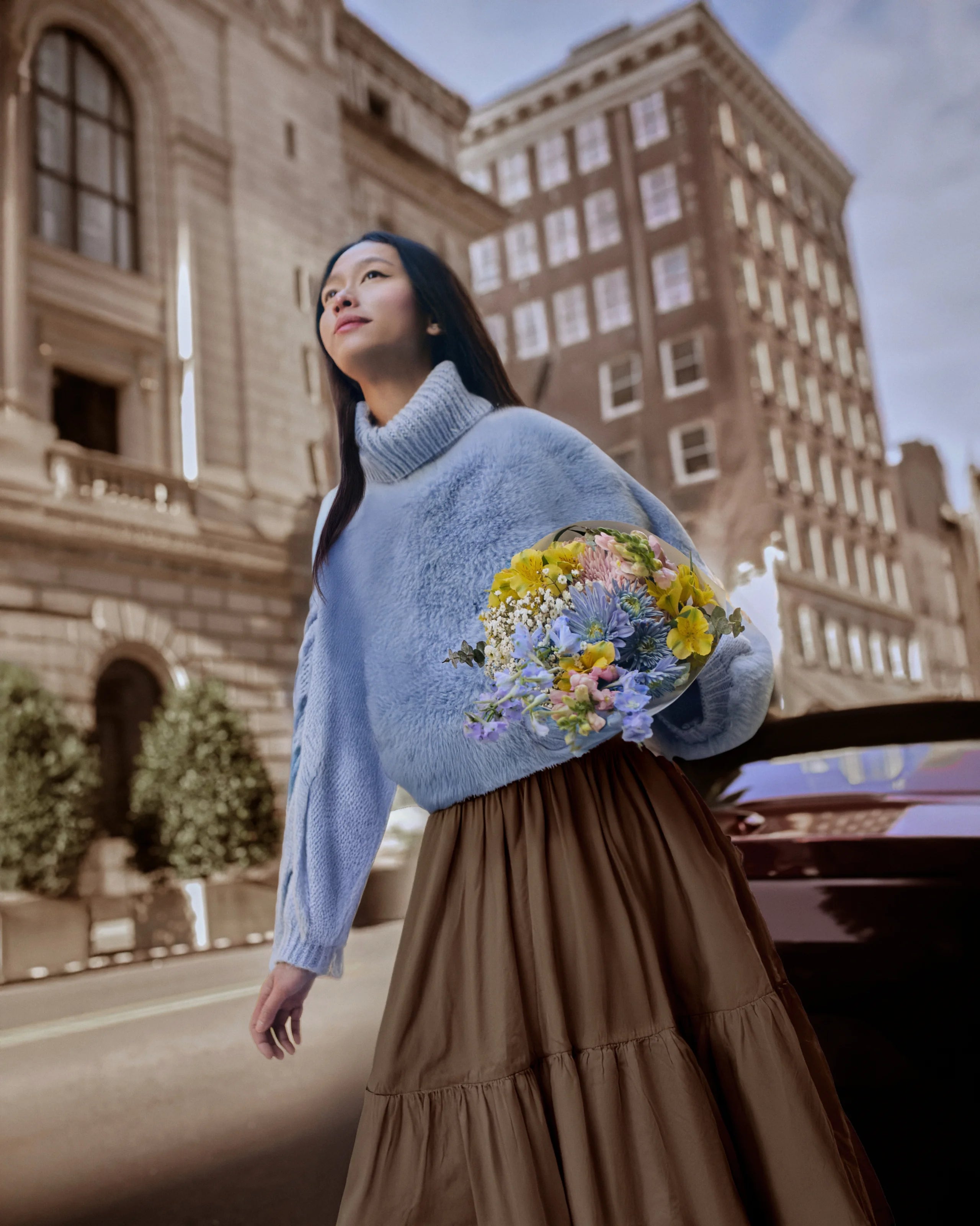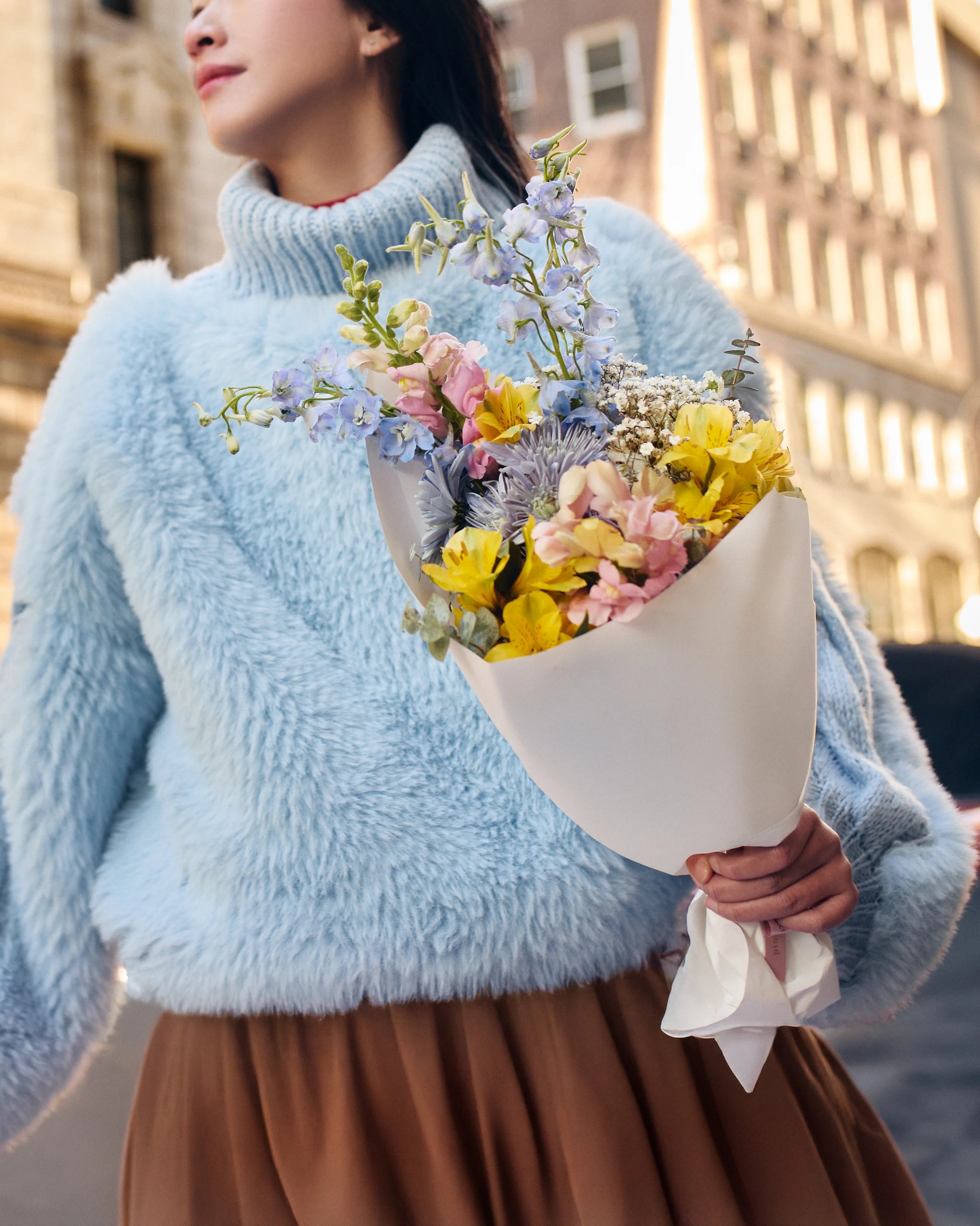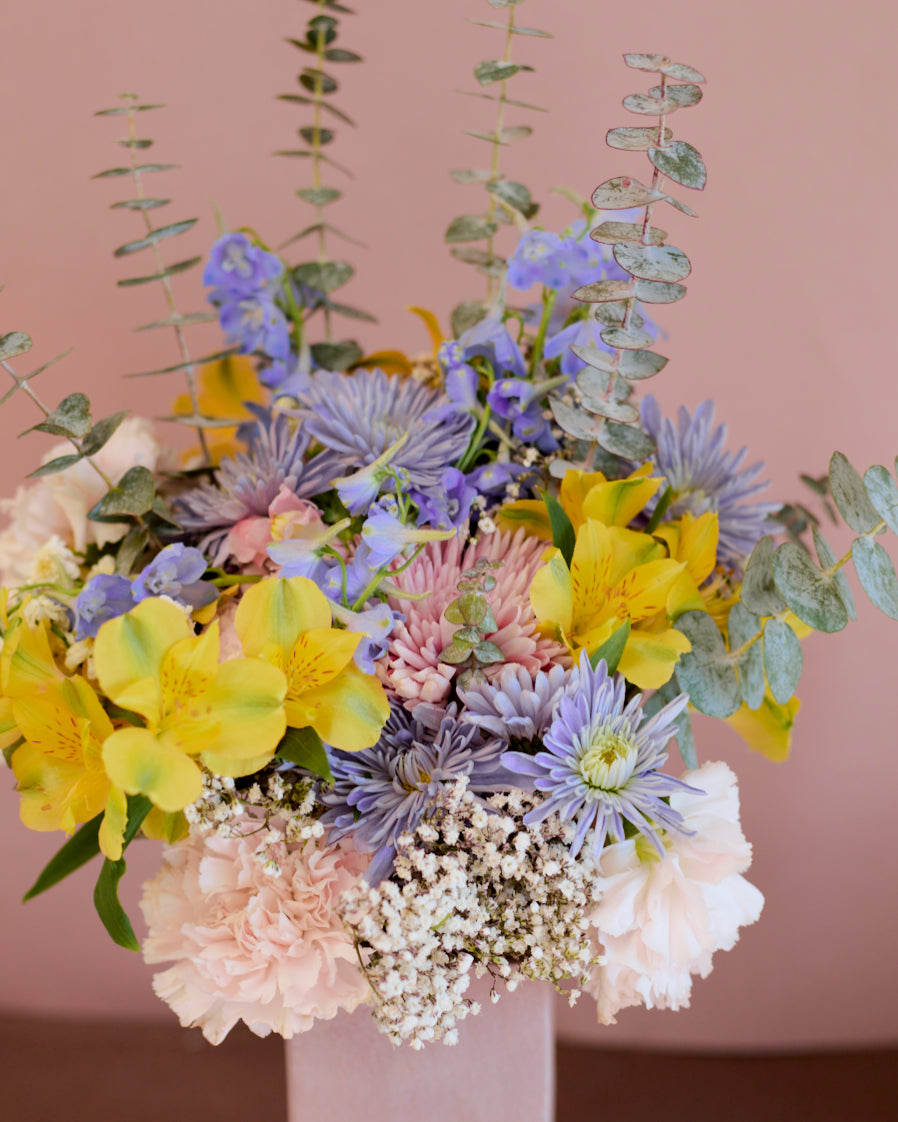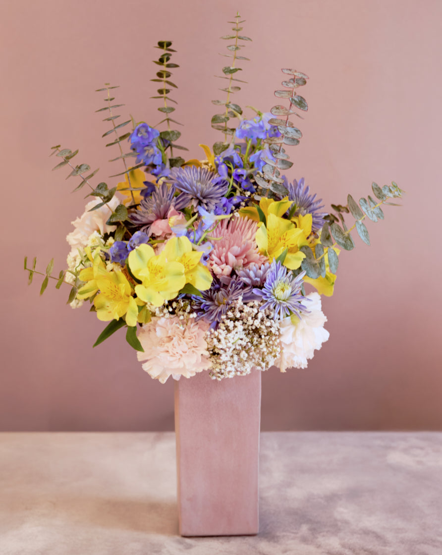 An everyday favorite that perfectly balances warmth and sophistication. This versatile arrangement brings together vibrant blue delphinium, sunny yellow chrysanthemums, and soft pink cushion mums, grounded by fresh eucalyptus. The perfect choice for a pick-me-up or simple thank you, this bouquet proves that everyday moments deserve beautiful flowers.