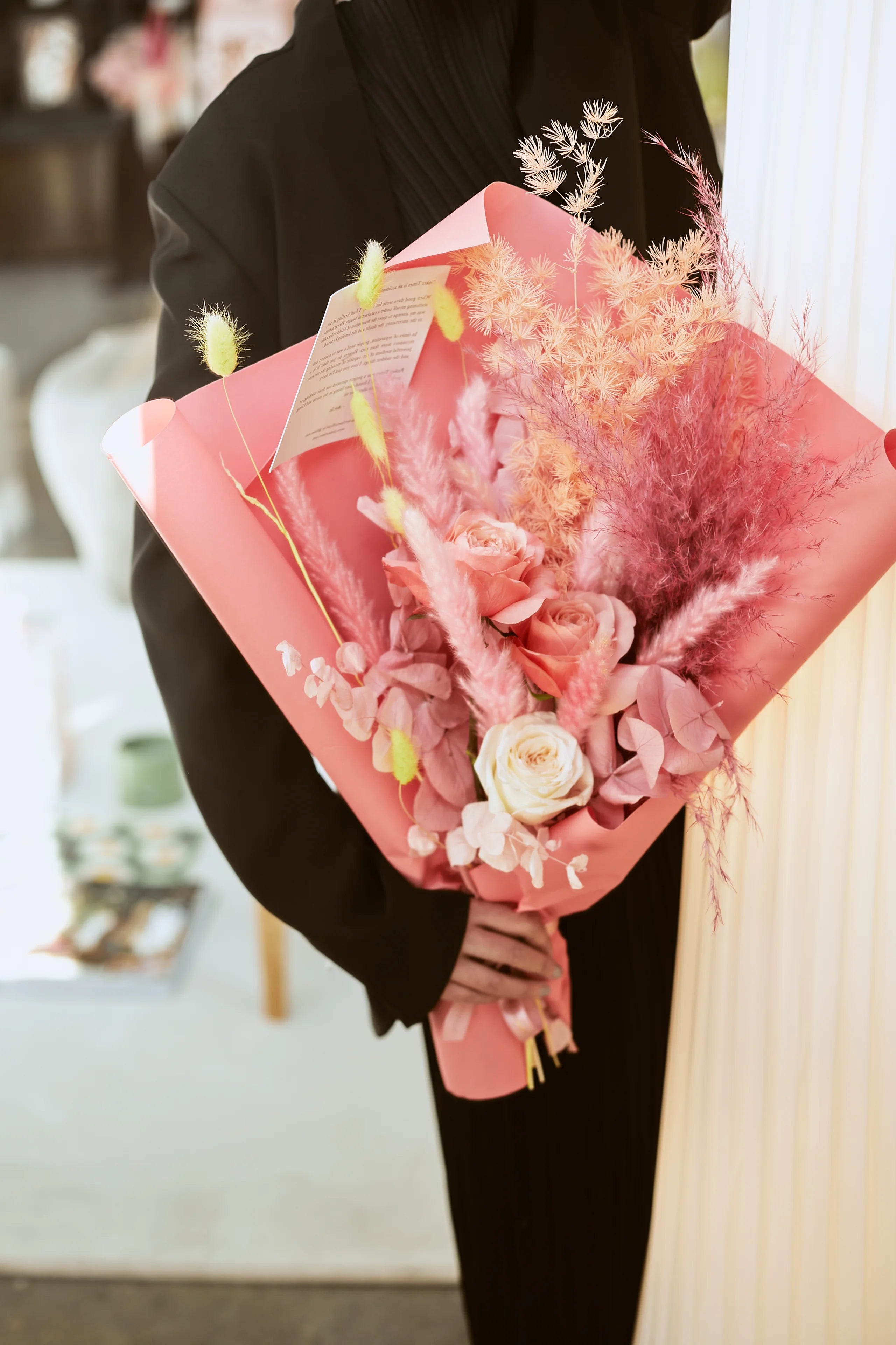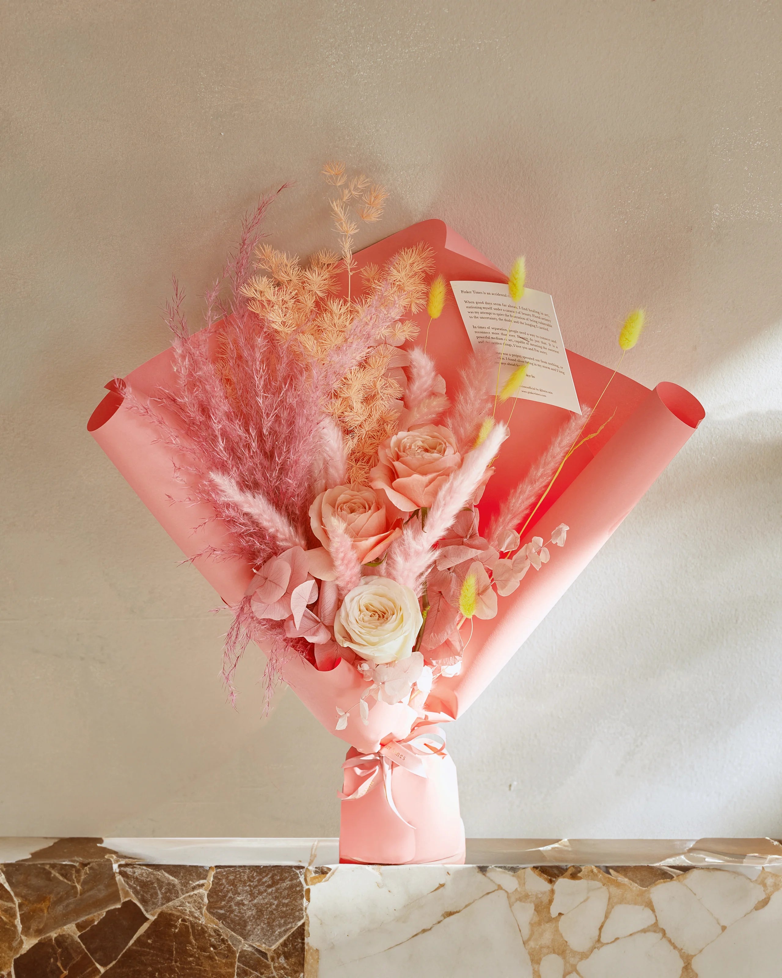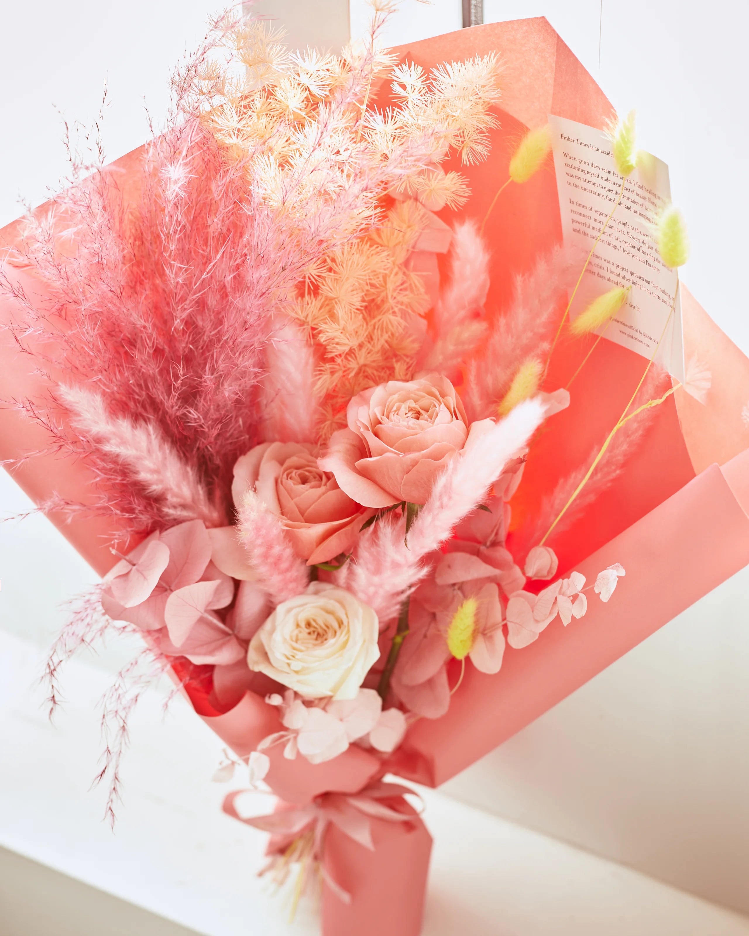 A combination of preserved elements arranged with beautiful fresh roses in a glowing, chic, and energetic Peachy Pink Palette.