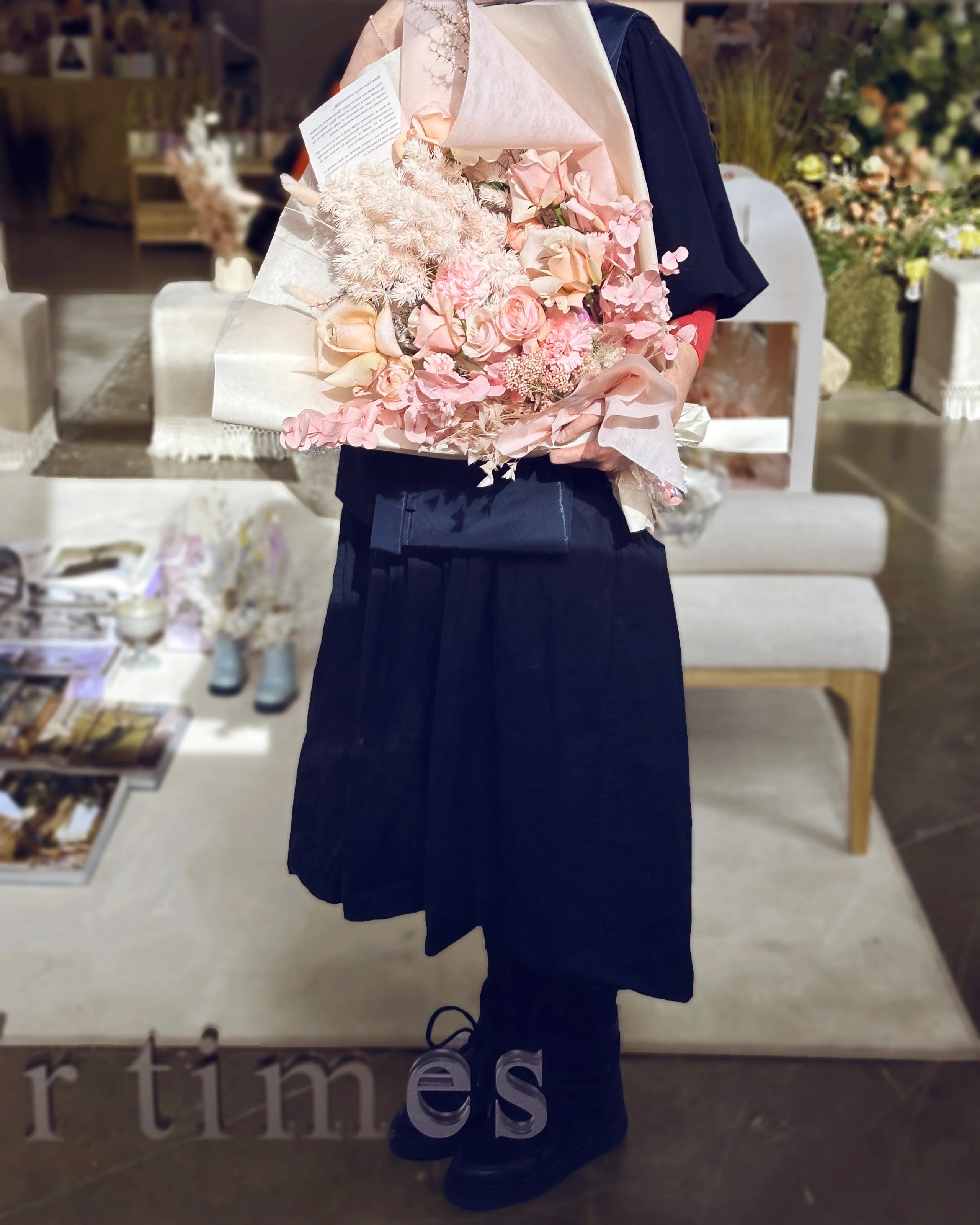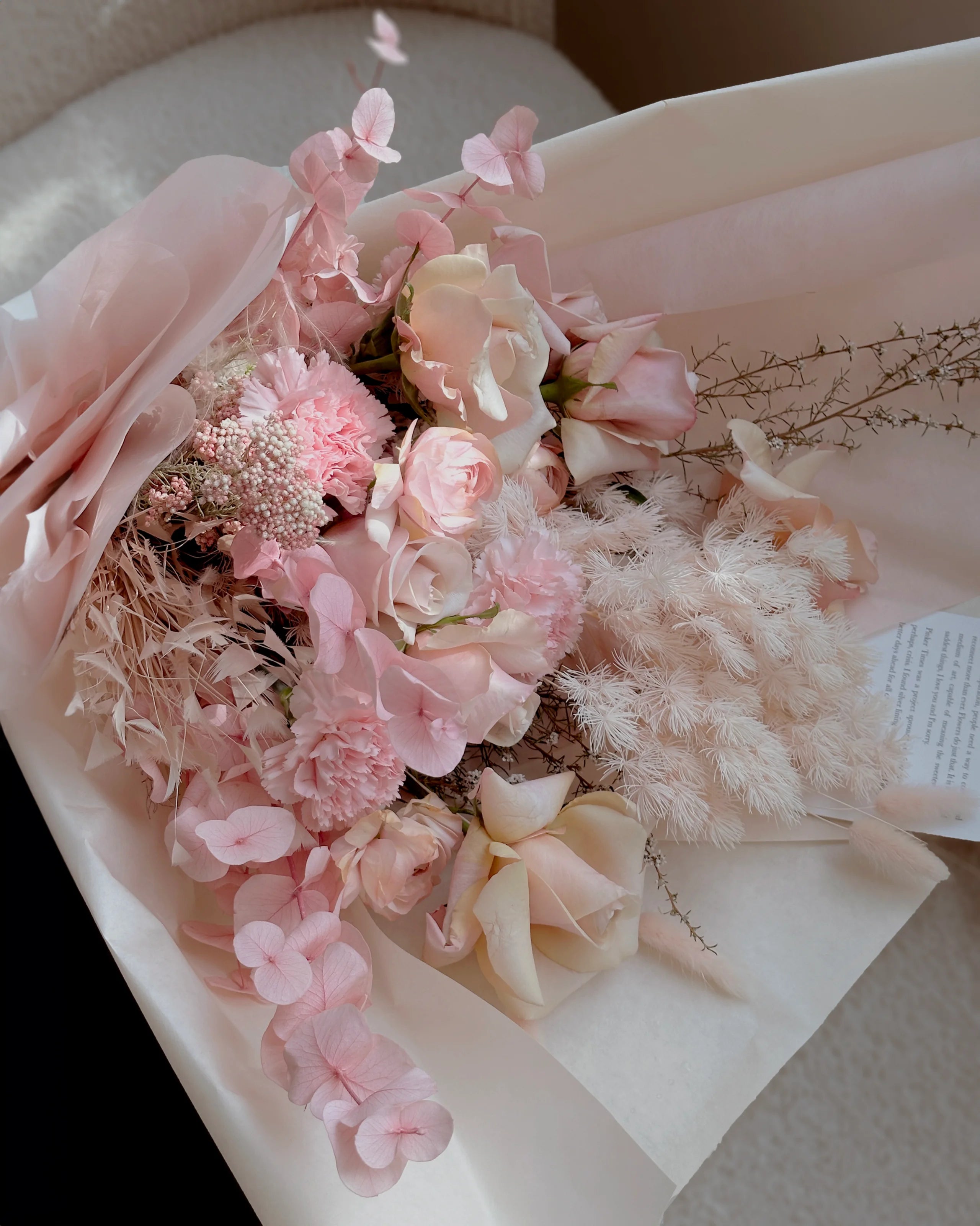 A combination of dried elements arranged with beautiful fresh roses in a soft, romantic glow of peach/ and pink hues.