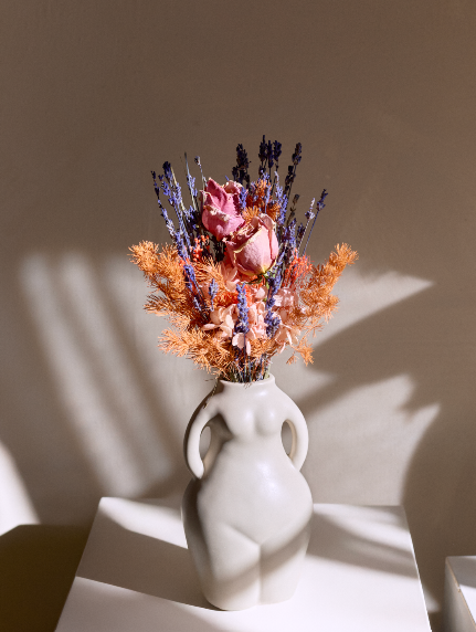 Each vessel cradles a delicate arrangement of dried roses, calming lavender, and seasonal blooms, creating a timeless piece that brings natural beauty to any space. The neutral ceramic tone perfectly complements the subtle hues of the preserved flowers, making each piece uniquely beautiful.