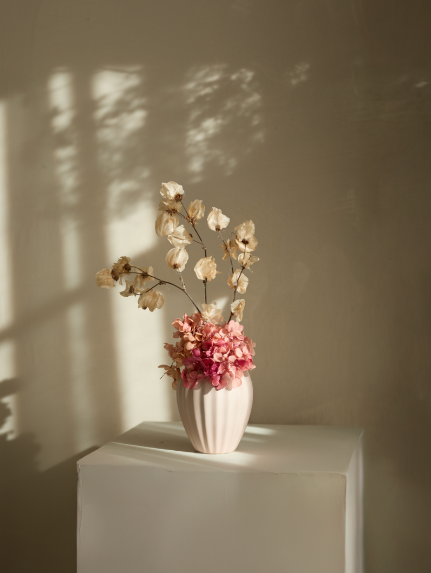 Symbolic for passion and love, this bud vase arrangement celebrates softness through textural storytelling. A gentle dialogue between plush preserved hydrangea and delicate bougainvillea petals, all housed in our signature bud vase. This monochromatic arrangement brings subtle romance and cloud-like texture to any space. Perfect for bedside tables or as an elegant desk companion, The Buddy offers lasting beauty without the fuss. Nature's tender moments preserved in time.