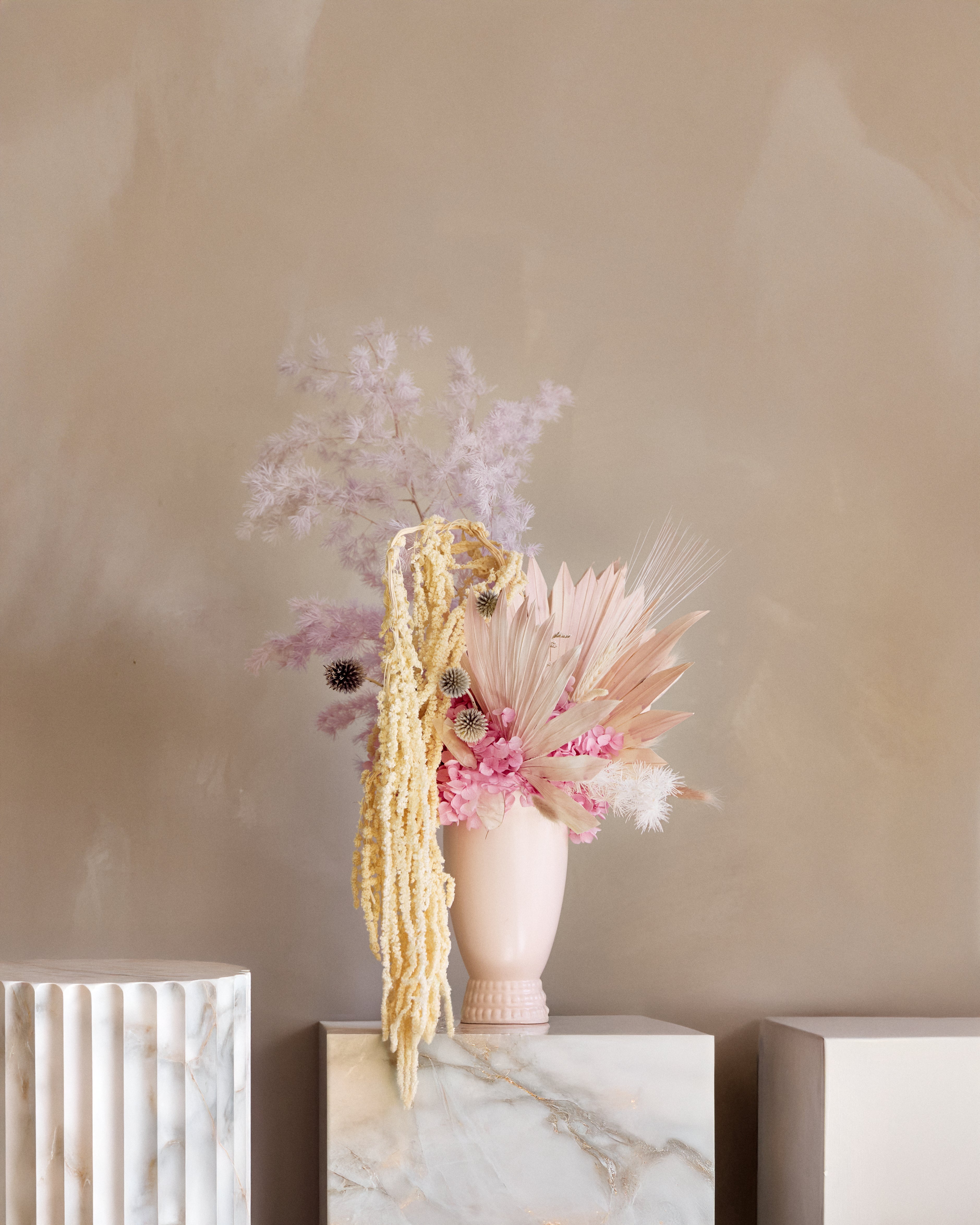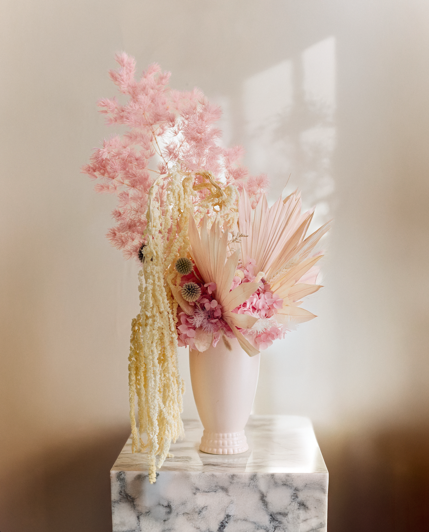 Light as air and full of whimsy, this preserved arrangement dances between soft pink and blush tones. Cascading butter-colored Amaranthus plays with gravity, while perky blue Echinops and pastel Ming fern add delightful pops of texture. Like a feather caught in a gentle breeze, these elements come together in a playful yet romantic symphony.