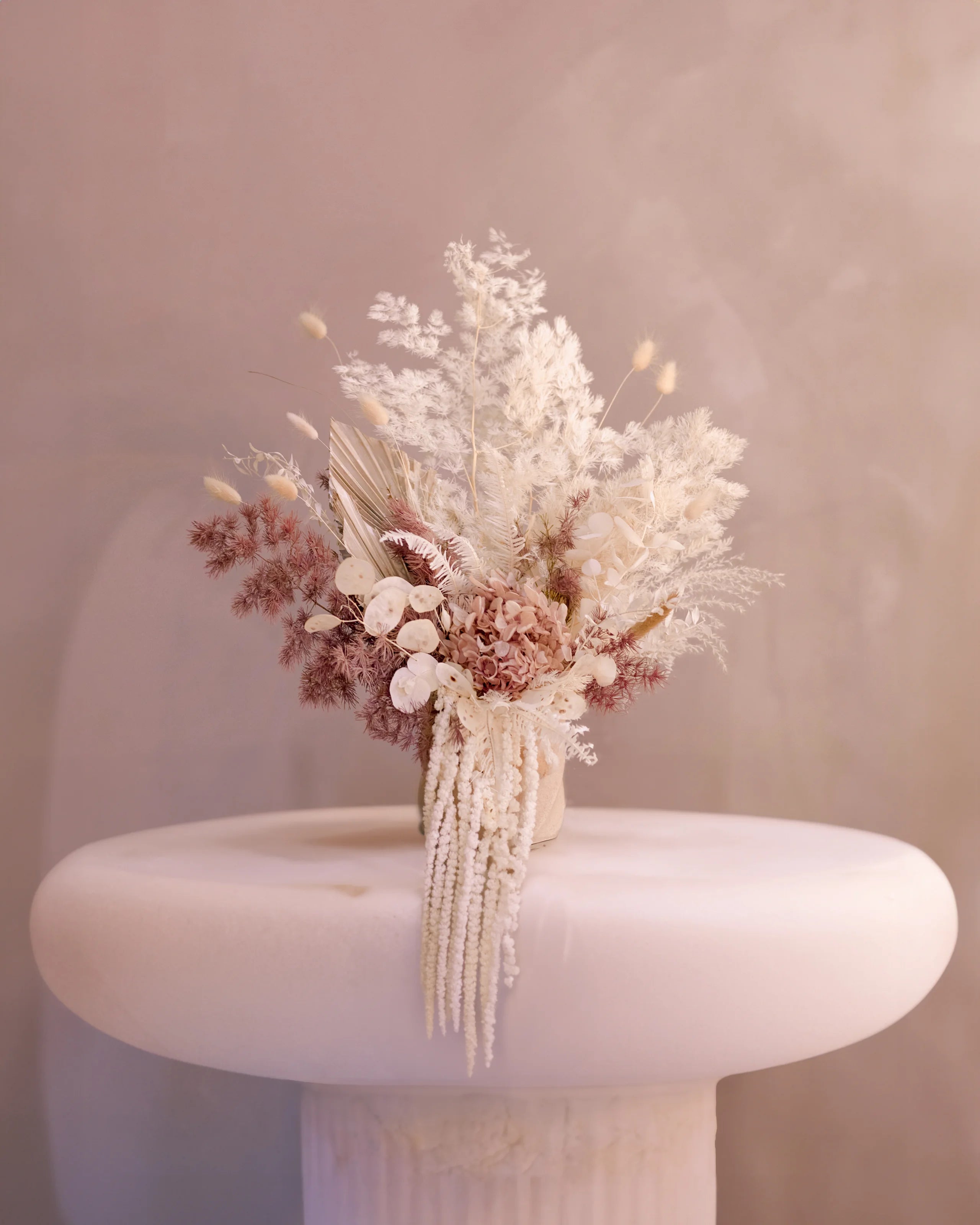 Visually striking, this monochromatic arrangement feels more akin to sculptural art than arranged florals. When color is absent, sensory details become heightened, drawing attention to nuances found in layers of textural details. Soft, cozy yet emotional l, just like a kiss.