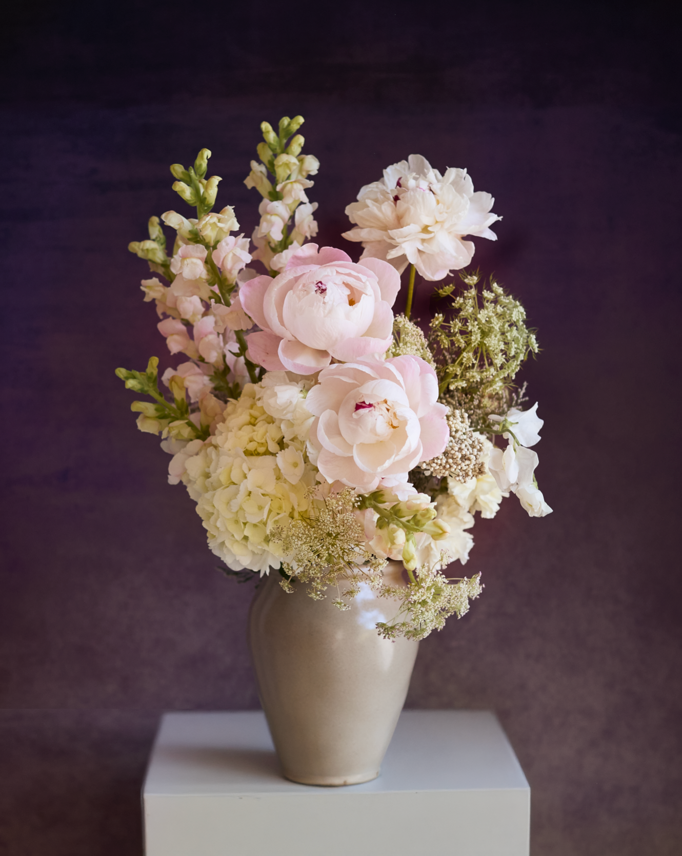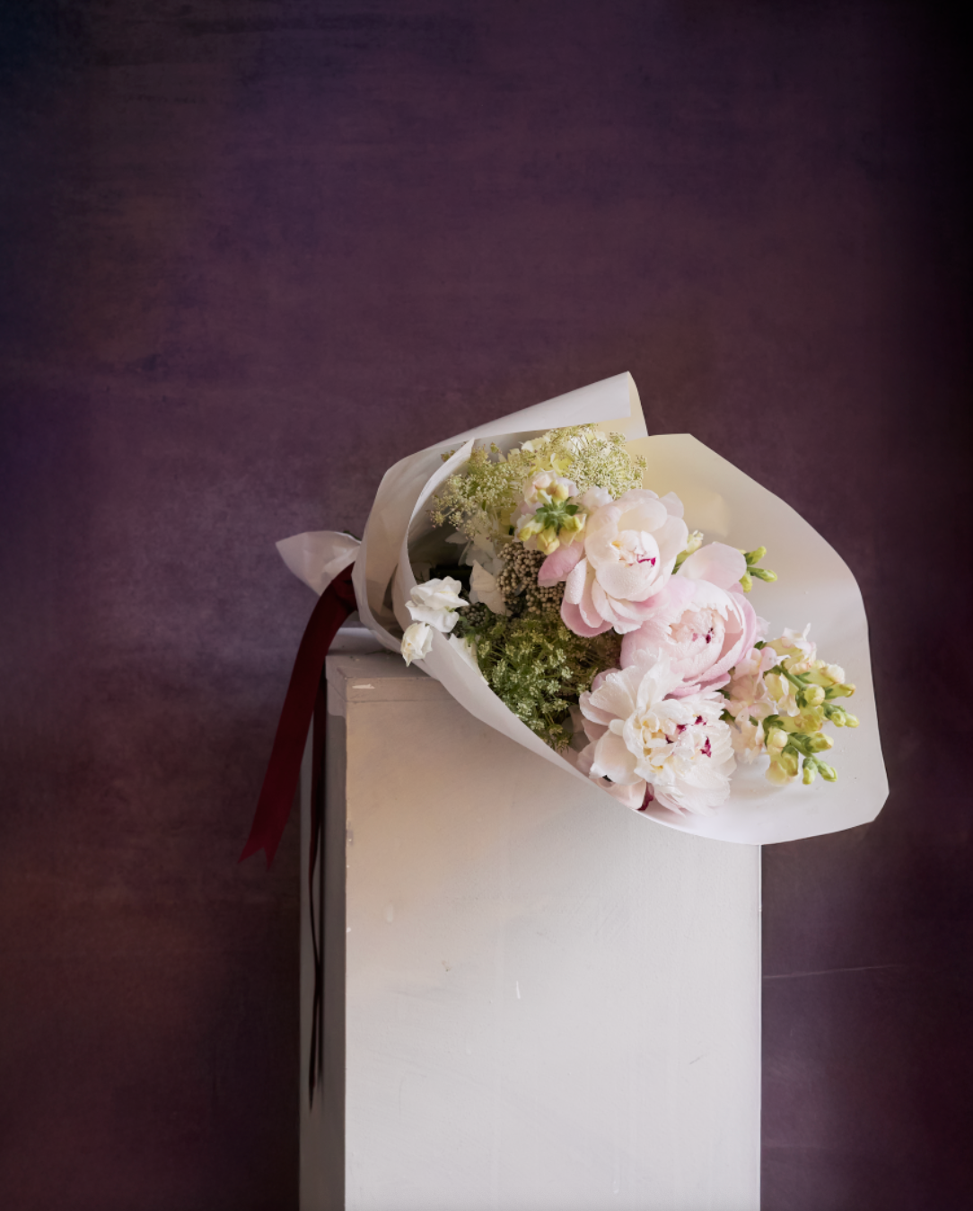 A quiet moment with three premium peonies in soft white and blush tones, paired with seasonal foliages and florals. Pivoine bouquet brings a touch of spring to any space — perfect for Mother’s Day or simply to enjoy through the season. Simple, elegant, and timeless, it’s an arrangement that celebrates the beauty of now.
