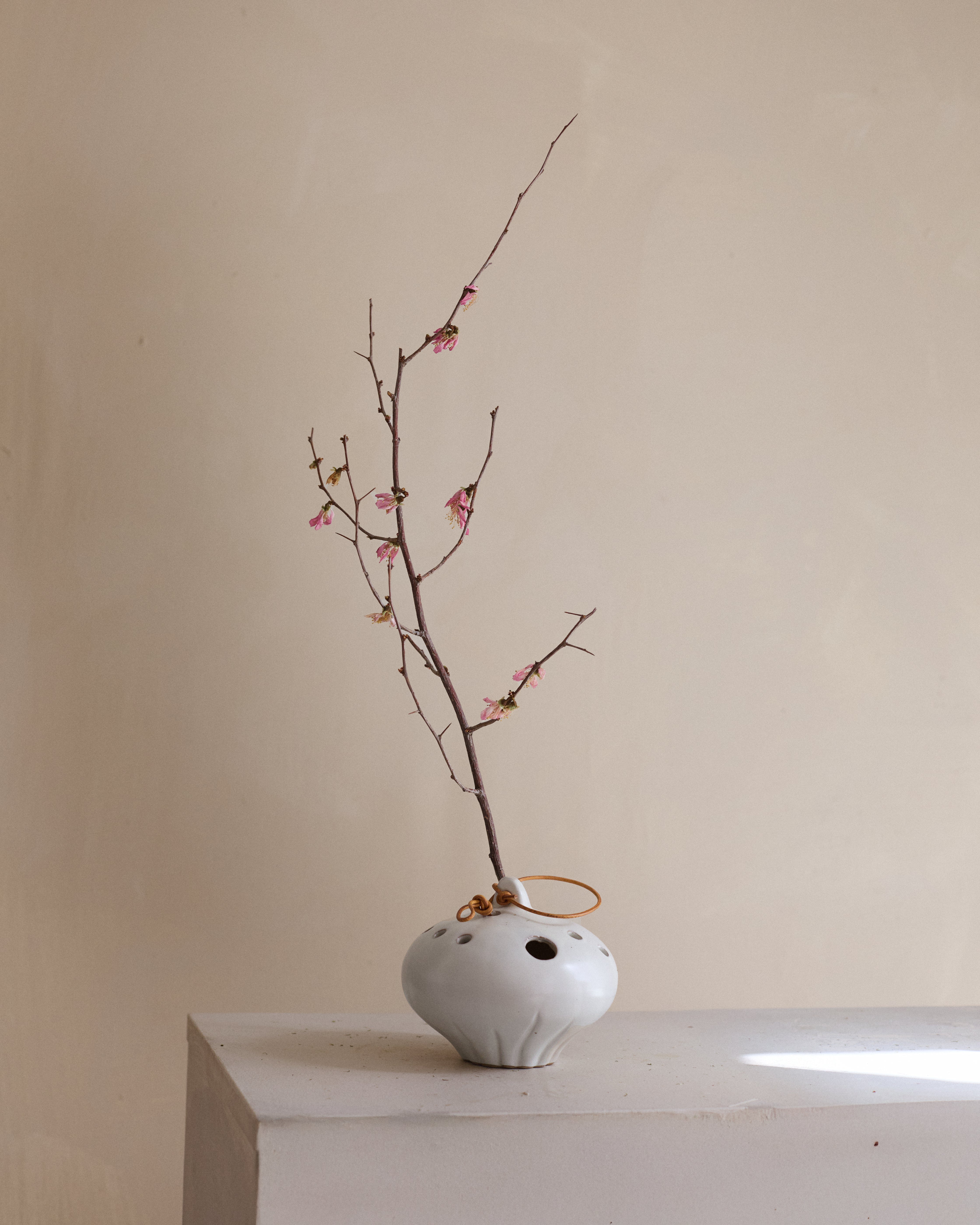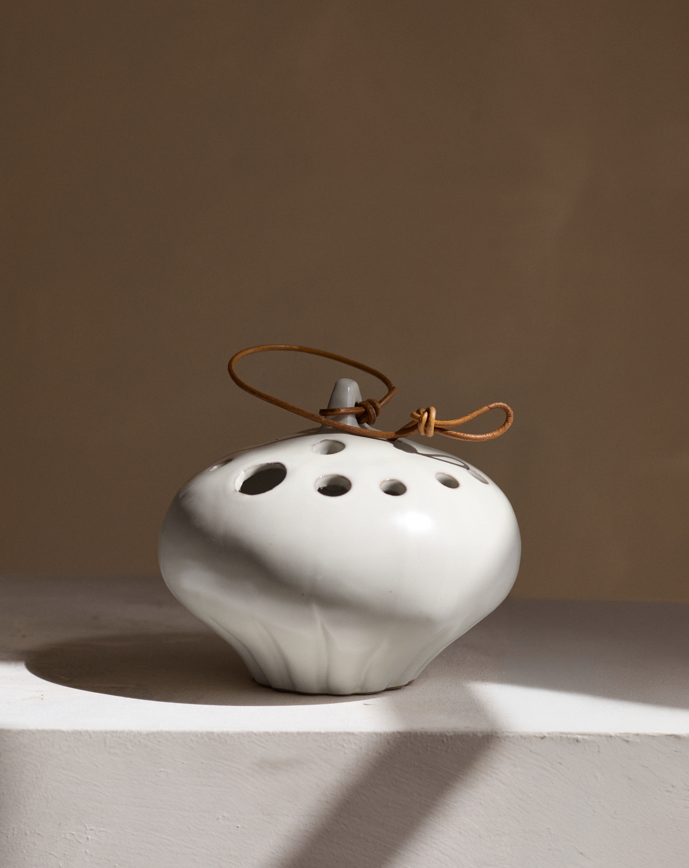 The White Lotus Ceramic Frog Vase mimics the elegant form of a lotus seed pod, creating an organic, zen-inspired vessel for your favorite blooms. This white ceramic piece features varying-sized holes perfect for arranging flower stems with artistic precision. Versatile in display, it can rest gracefully on a table or hang via the included leather string for a floating garden effect. Its natural, elegant design brings calm beauty to any space while functioning as both practical vase and artistic décor.