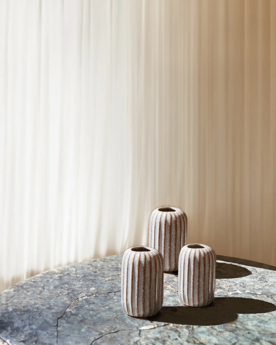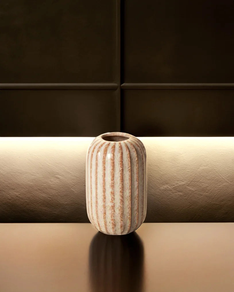 Vertical lines and an interplay of earthly palettes breathe life into its basic cylindrical structure. Position it anywhere, and when you include a selection of dried or fresh stems, you'll create a vivid burst of color and depth. Material : Ceramic