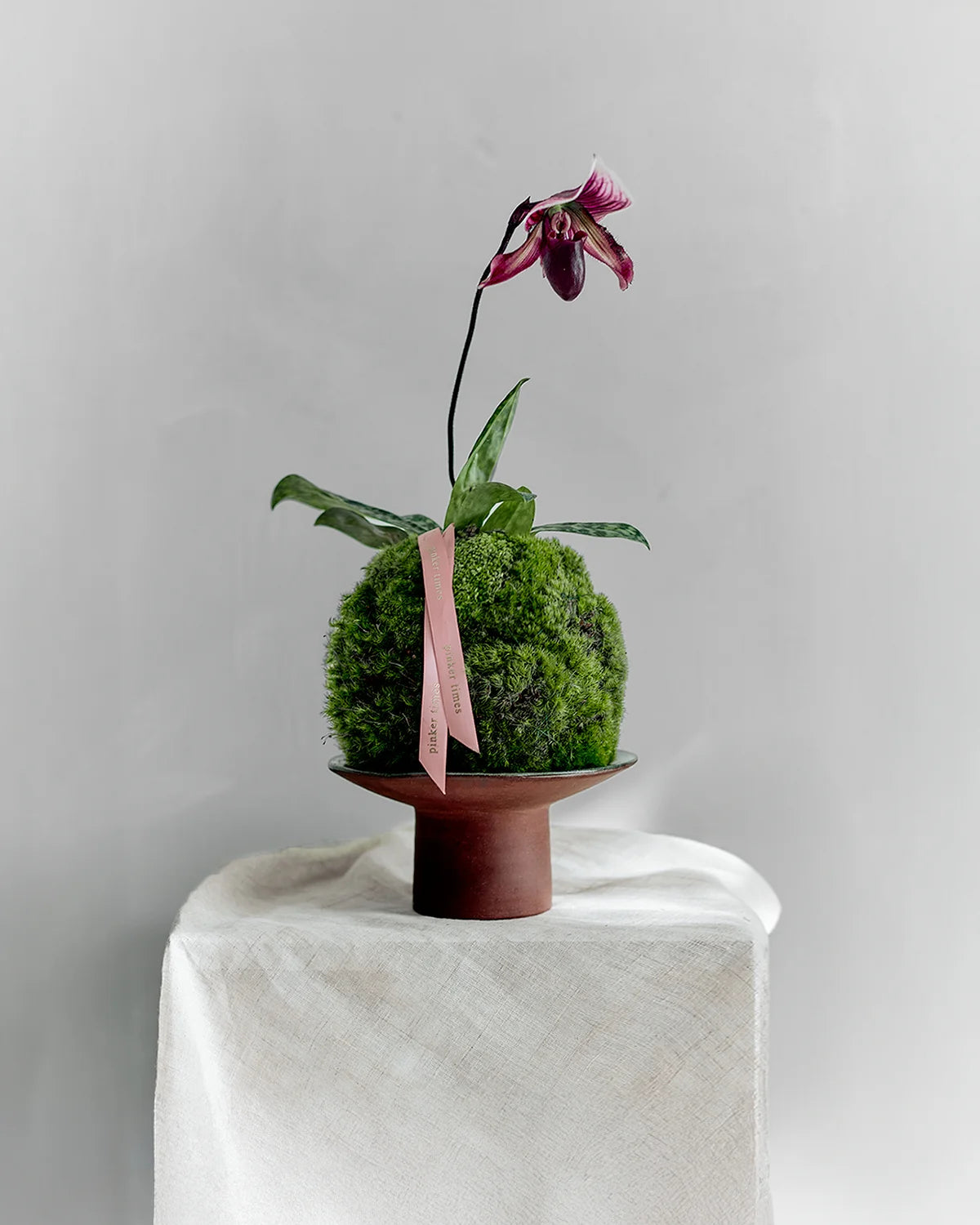 Our rare Lady Slipper Orchid Kokedama rests gracefully on a ceramic compote dish, transforming this delicate botanical treasure into a stunning display piece. Handcrafted with care, the orchid's unique slipper-shaped blooms emerge from a meticulously formed moss ball, creating a living work of art that brings exotic beauty to any interior space.