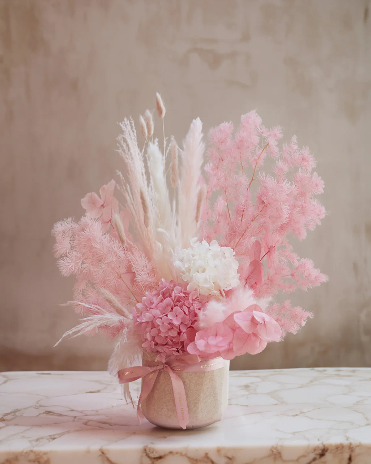 Monochromatic arrangements of all the pink and white preserved varieties are sweeping their way through the floral world. The palette designed with an intentional lack of contrast is redeemed with textural florals and foliage like Umbrella Fern, Hydrangeas, Bunny Tails, Baby Breath, and Sea Lavender. Arranged with boldly contrasting textures and sculptural shapes, this preserved arrangement adds an abundance of otherworldly beauty to your space.
